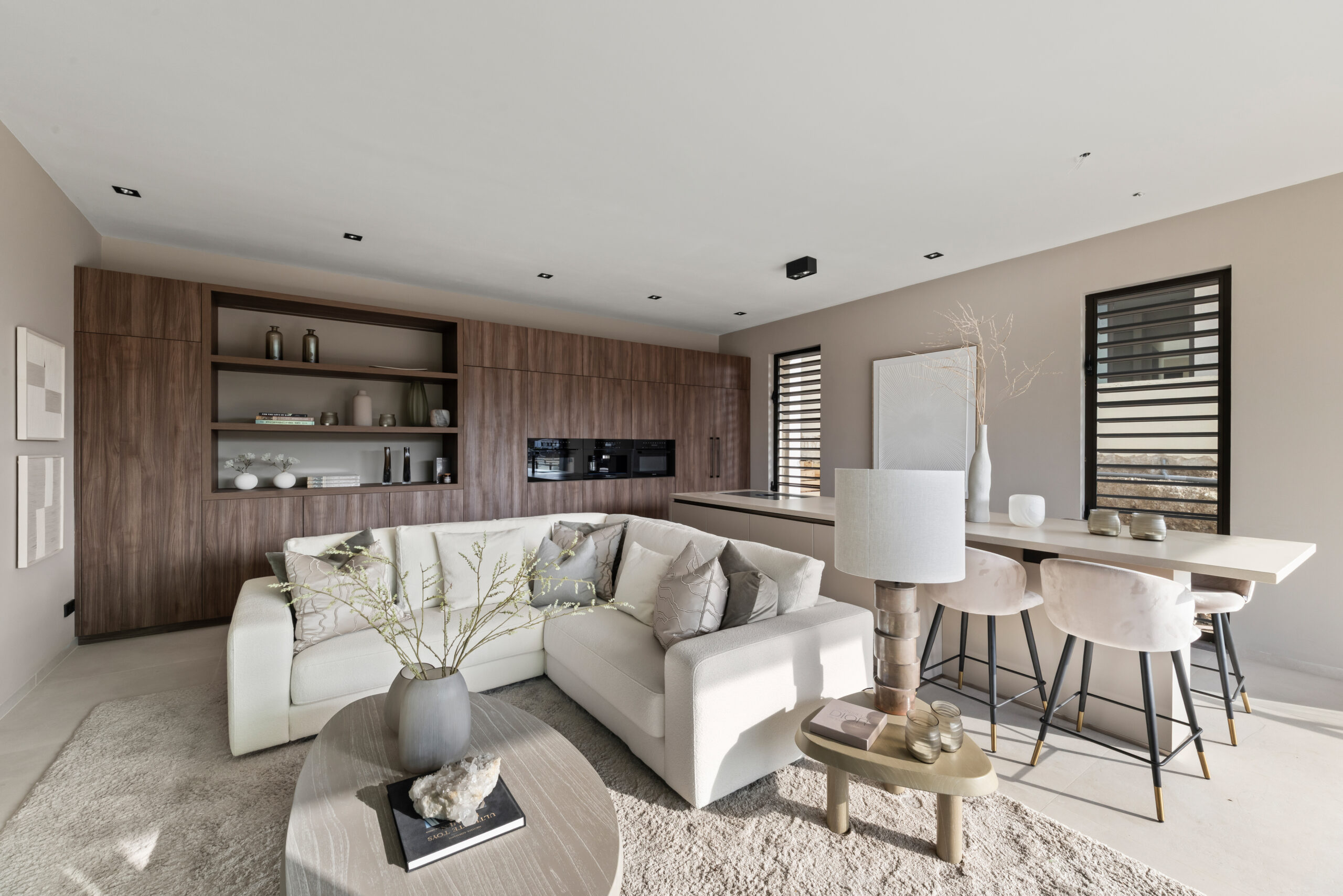 Het Azure-appartement is gelegen op de tweede etage en heeft een vergelijkbare, praktische indeling als het Celeste-type. Via de weg aan de achterzijde van het gebouw rijdt u naar het parkeerniveau op de tweede verdieping, waar u beschikt over uw eigen parkeerplaats. De entree leidt u direct naar het overdekte terras aan de voorzijde met ruimte voor een lounge- en eethoek. Binnen stapt u in de open leefruimte en keuken, die dankzij de 3 meter hoge plafonds en grote glazen schuifpuien overvloeien in de buitenruimte.