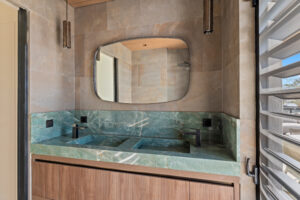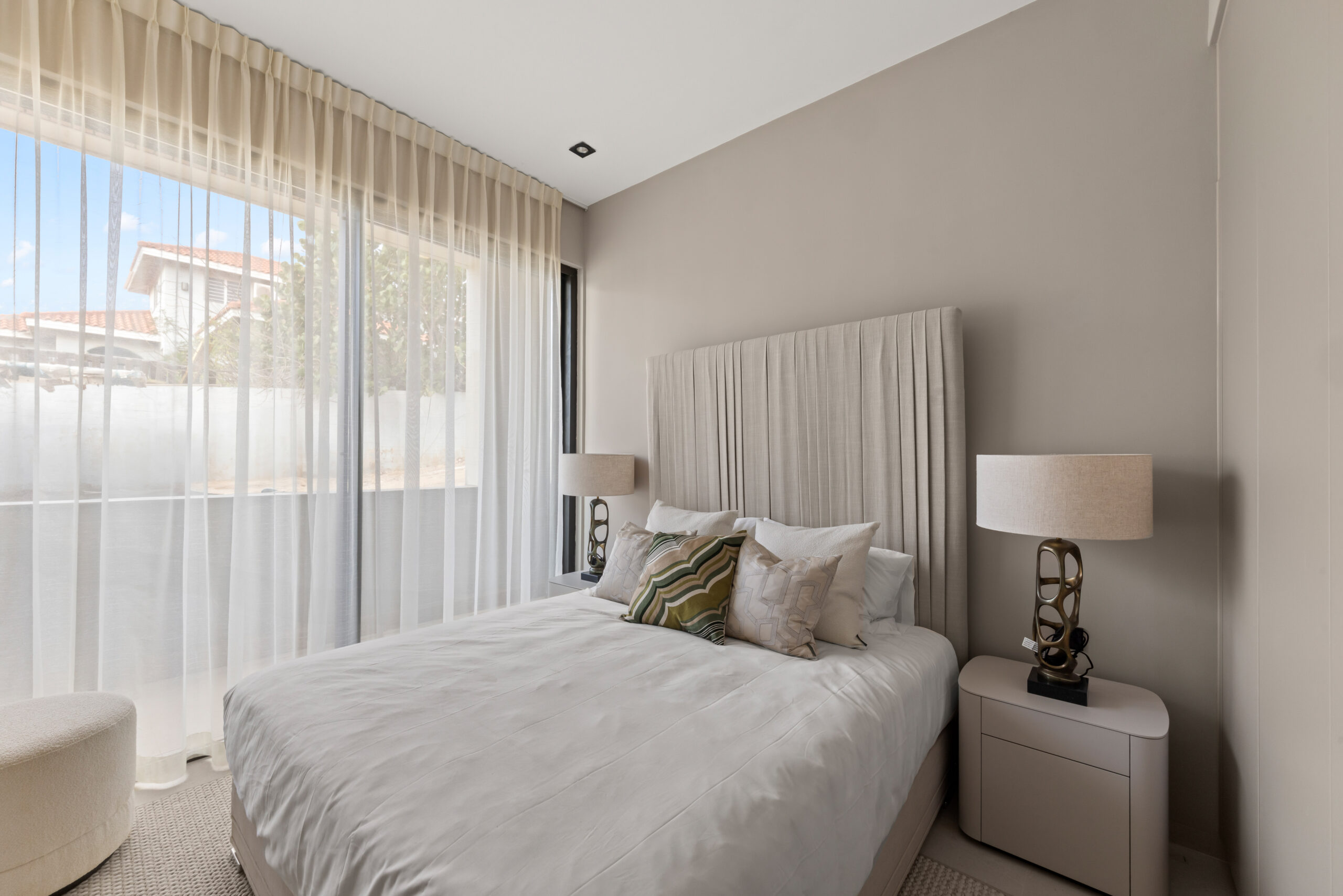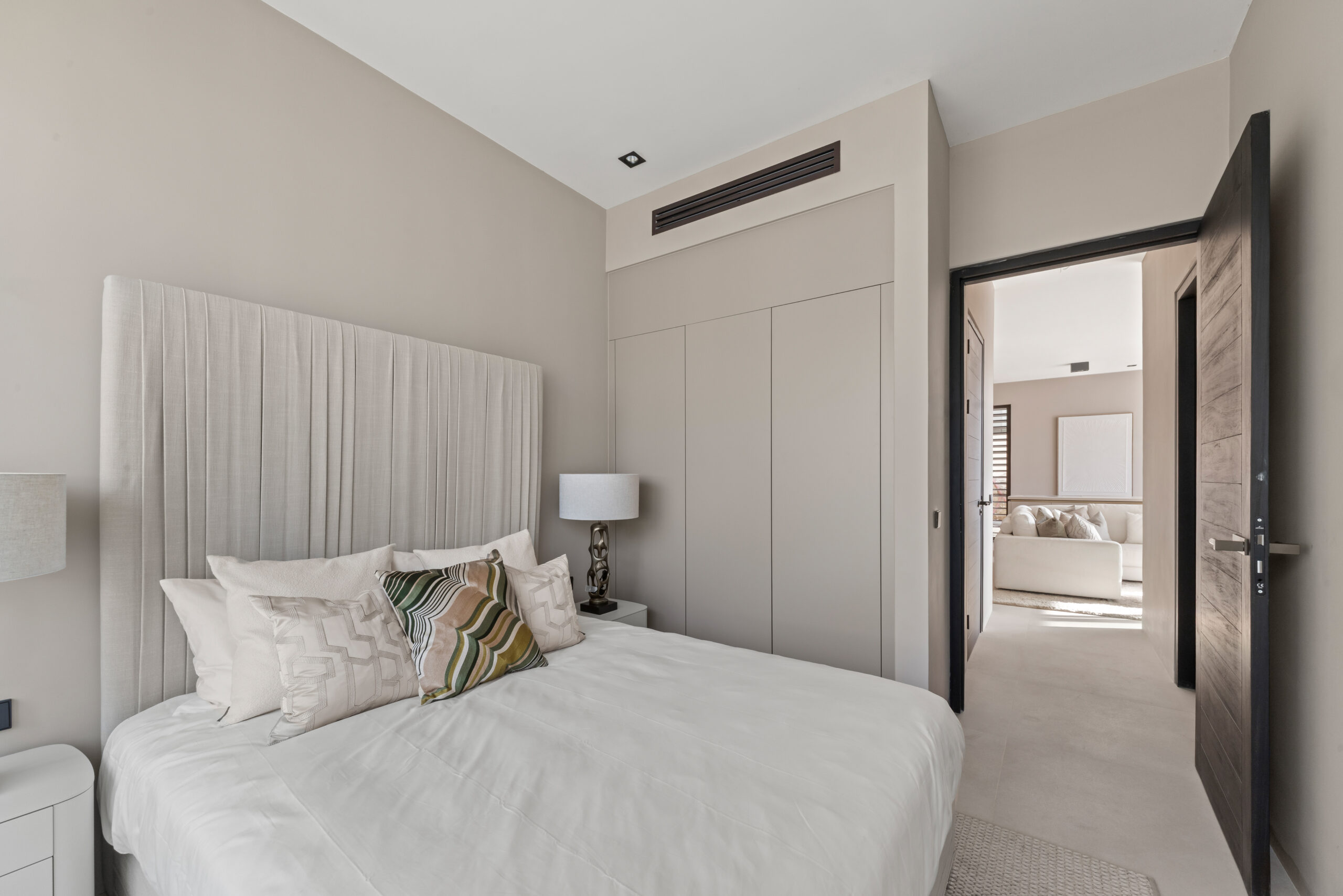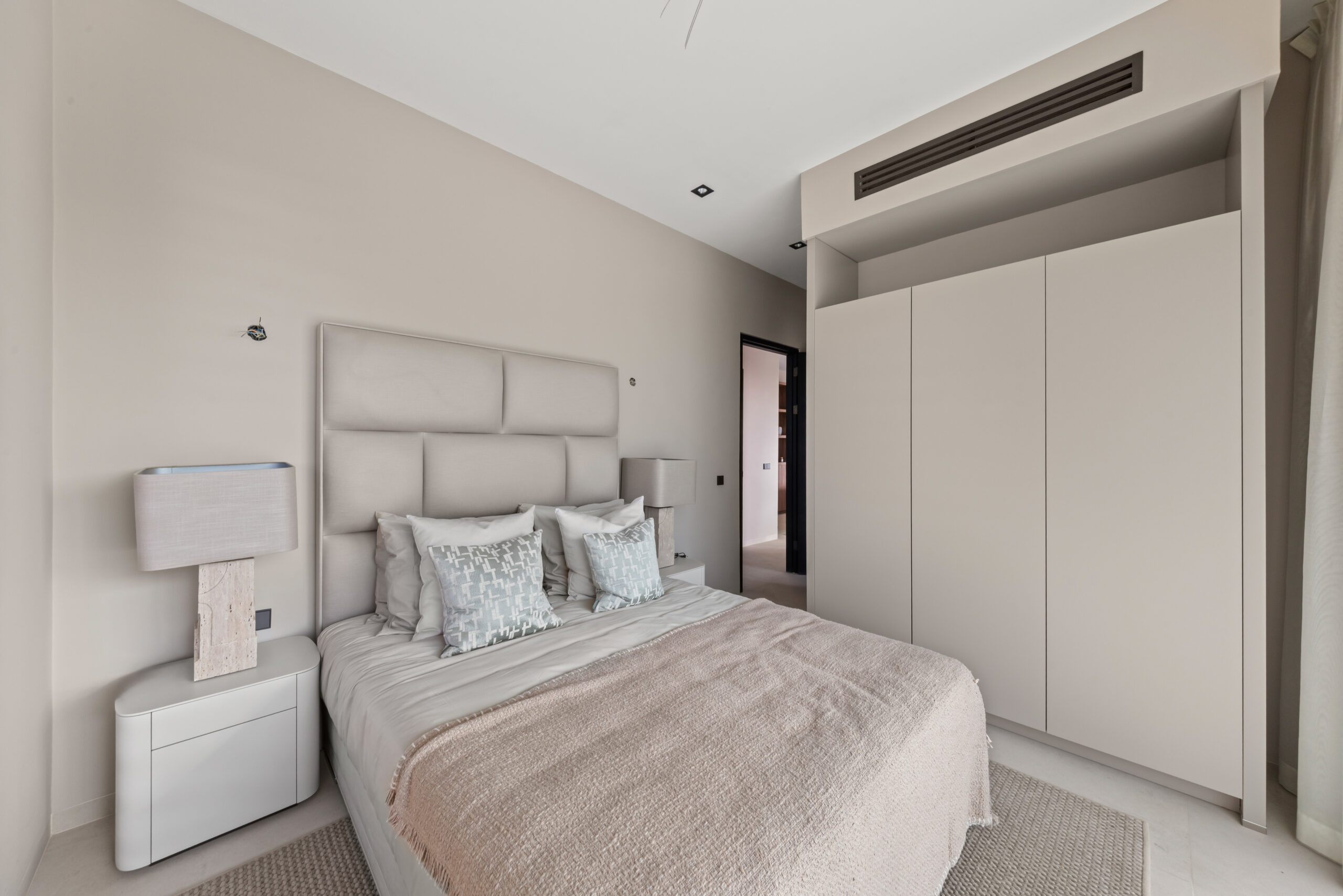 Via een centrale hal bereikt u het slaapgedeelte. De luxueuze master bedroom beschikt over een en-suite badkamer en opent direct naar het overdekte hoofdterras. De tweede slaapkamer heeft toegang tot een eigen, intiem privéterras en ligt naast de tweede badkamer. Beide badkamers zijn hoogwaardig afgewerkt met een dubbele wastafel, ruime inloopdouche en modern toilet. Beide slaapkamers zijn uiteraard voorzien van airconditioning en praktische inbouwkasten. Tot slot beschikt de woning over een handige berging met wasmachineaansluiting.