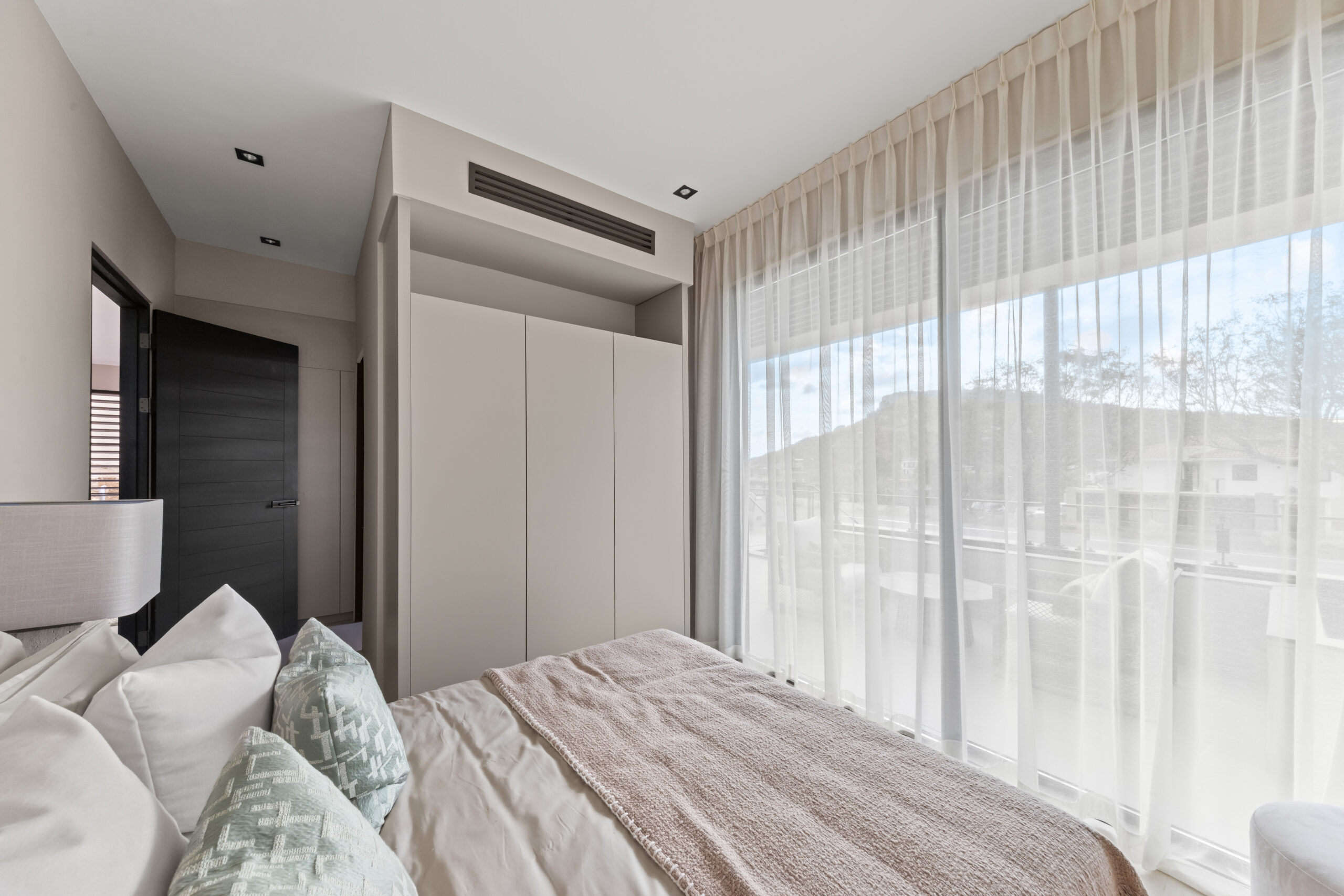 2 slaapkamers met airconditioning, inbouwkasten en toegang tot een terras