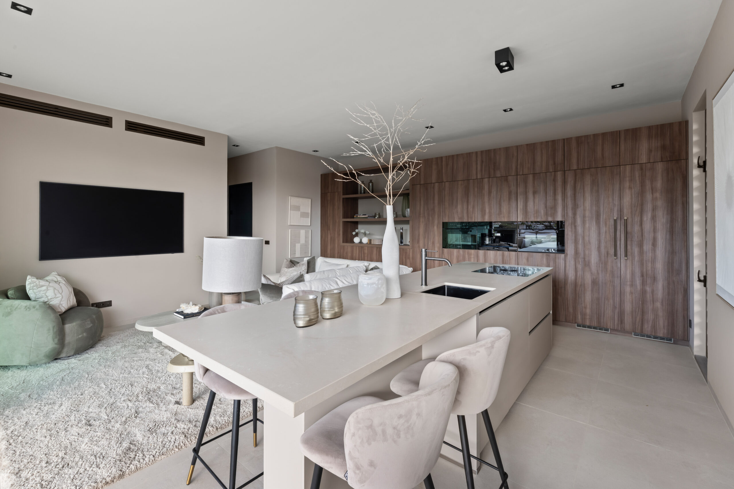 Dit appartement (ca. 123 m²) kenmerkt zich door een uitzonderlijk hoog afwerkingsniveau, ontworpen door architect Lyongo Juliana, met uitsluitend hoogwaardige Europese materialen. De stijlvolle open keuken vormt het hart van de leefruimte en is voorzien van een kastenwand, een kookeiland met zitgedeelte en state-of-the-art inbouwapparatuur (o.a. inductiekookplaat met geïntegreerde afzuiging, stoomoven en klimaatkast). Voor de ultieme luxe-ervaring is er optioneel een exclusief interieurpakket van een gerenommeerde topontwerper beschikbaar.