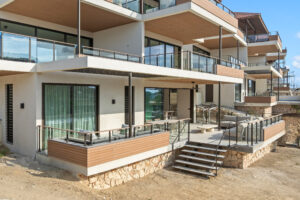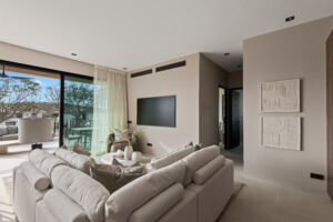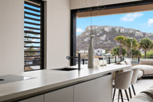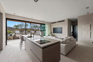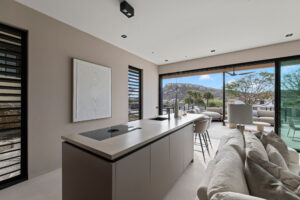 Het appartement is ideaal gelegen op de begane grond. Vanaf uw privéparkeerplaats direct voor de deur loopt u zo naar het overdekte hoofdterras met lounge- en eetgedeelte. Eenmaal binnen stapt u in de royale open leefruimte en keuken, die dankzij de 3 meter hoge plafonds en grote glazen schuifpuien heerlijk licht en ruimtelijk aanvoelt.