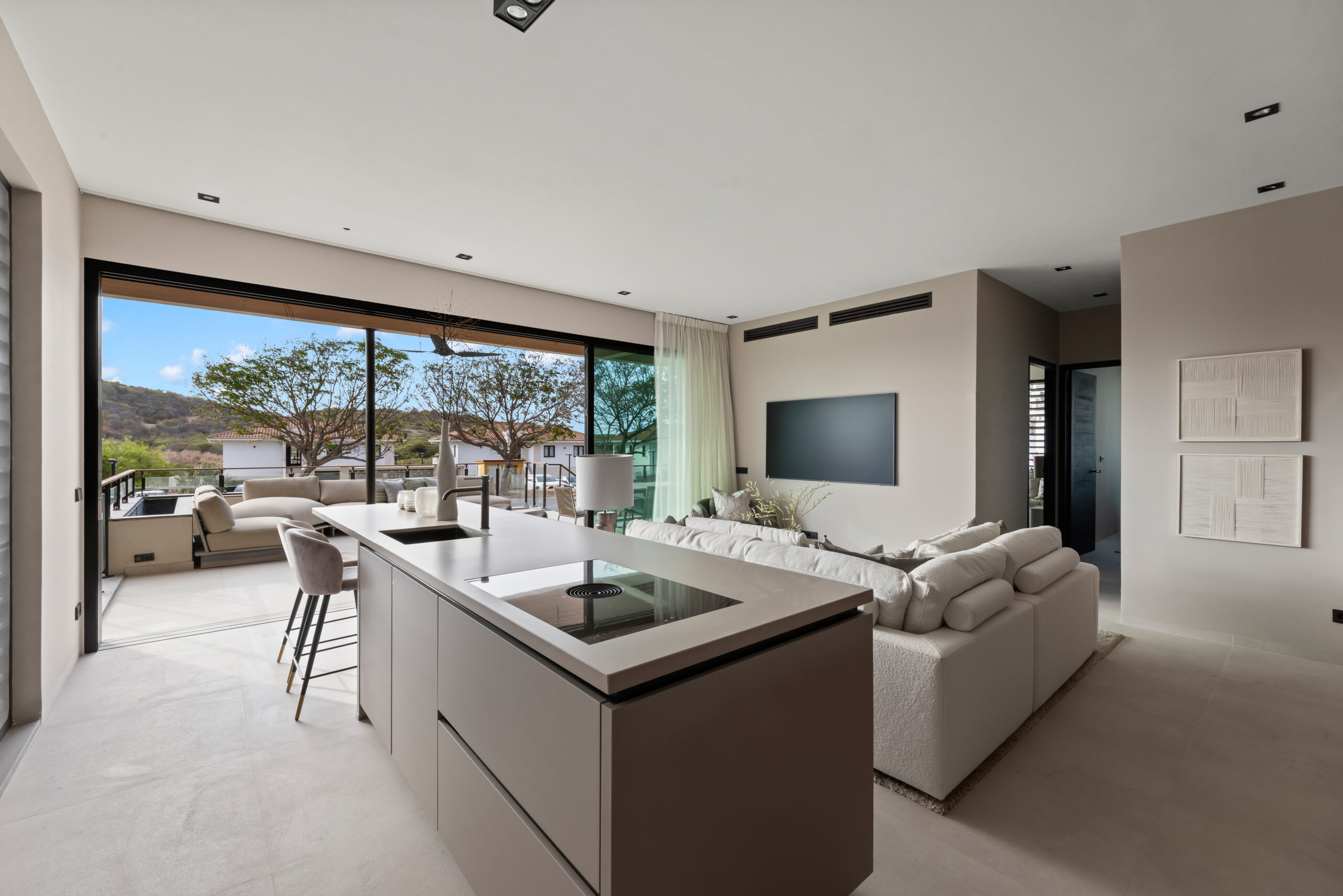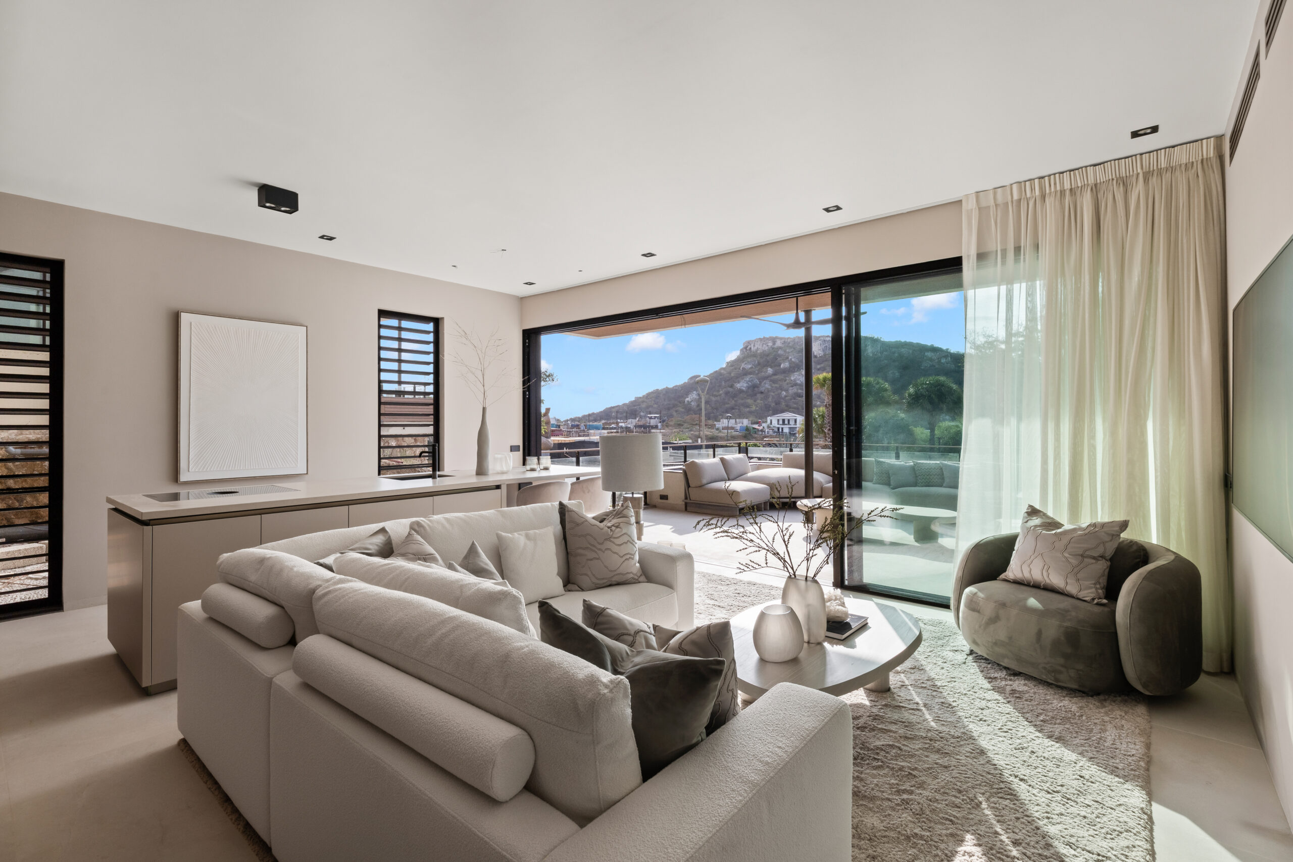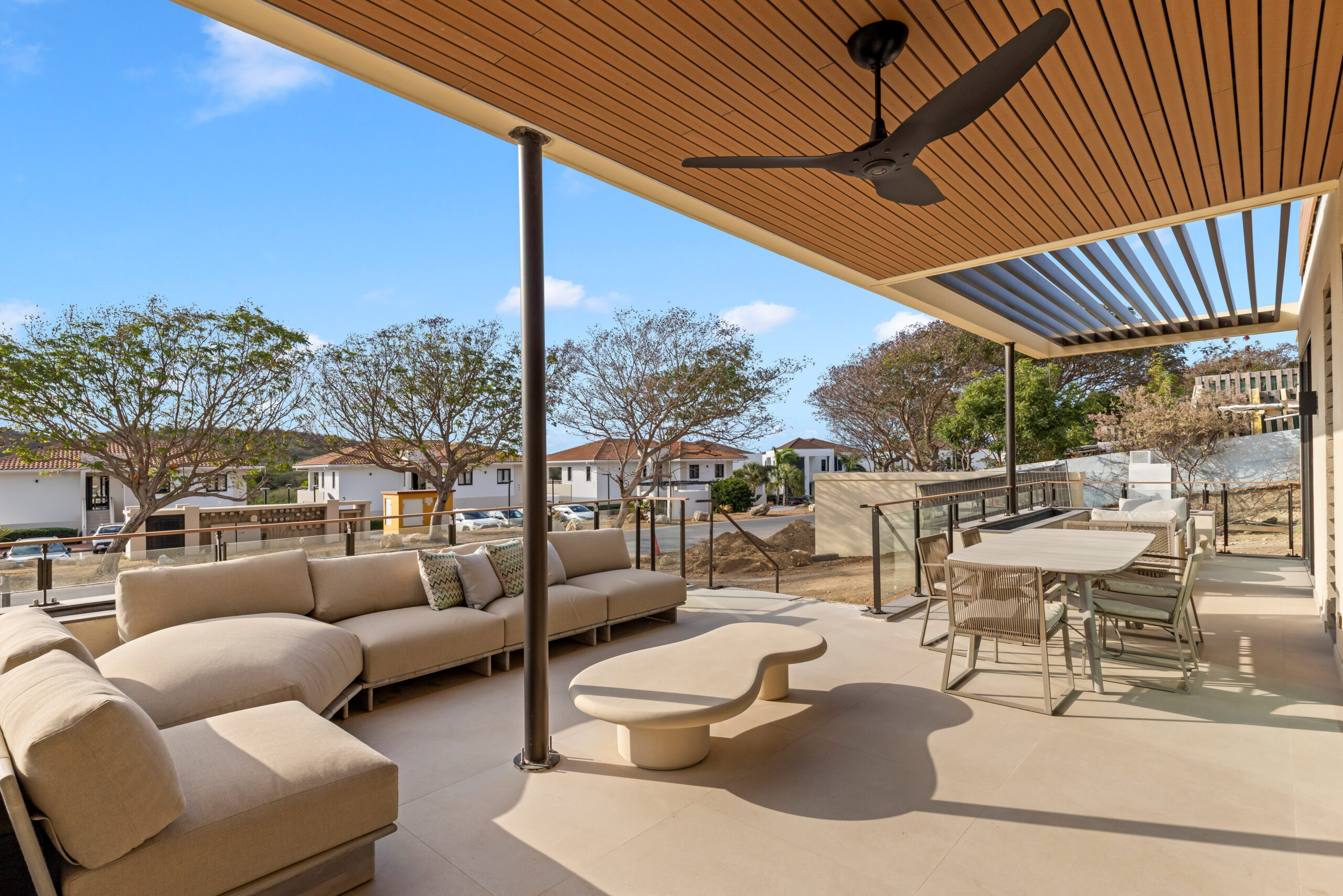 Omdat dit een begane grond appartement is, vloeien binnen en buiten moeiteloos in elkaar over. Het ruime, overdekte hoofdterras is de perfecte plek om te dineren of te ontspannen, prachtig omgeven door tropische beplanting die zorgt voor schaduw en een optimale natuurlijke ventilatie door de passaatwind. De toevoeging van een extra privéterras bij de tweede slaapkamer biedt bovendien extra privacy voor gasten of familieleden.