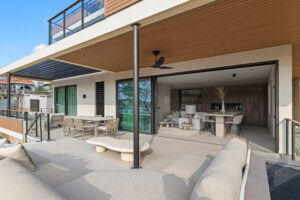 Lichte living met 3 meter hoge plafonds en glazen schuifpuien